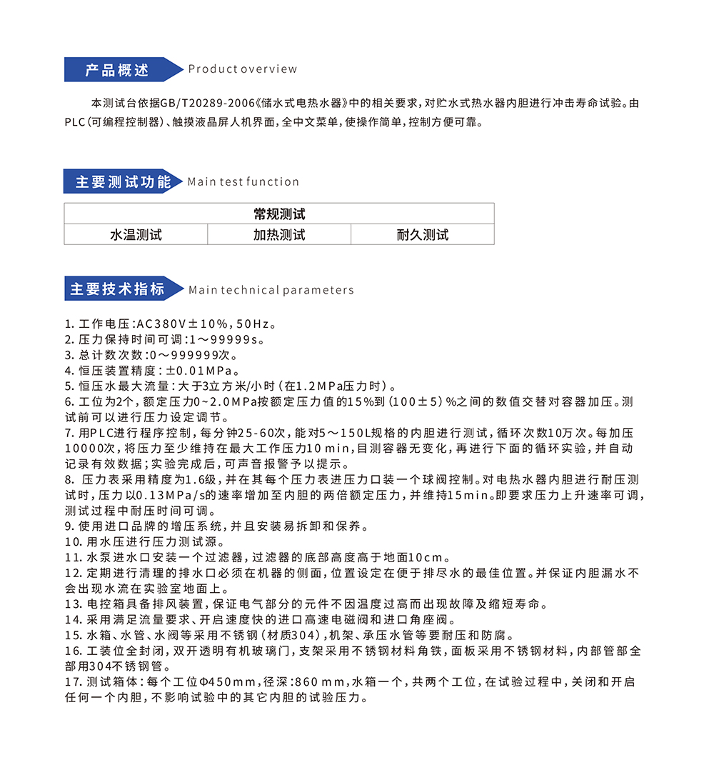本测试台依据GB/T20289-2006《储水式电热水器》中的相关要求,对贮水式热水器内胆进行冲击寿命试验。由 PLC(可编程控制器)、触摸液晶屏人机界面,全中文菜单,使操作简单,控制方便可靠。