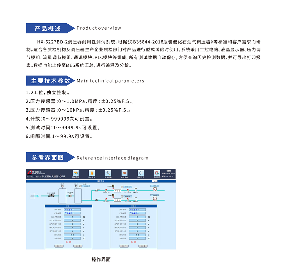 HX-6227BD-2调压器耐用性测试系统,根据《GB35844-2018瓶装液化石油气调压器》等标准和客户需求而研制。适合各质检机构及调压器生产企业质检部门对产品进行型式试验时使用。系统采用工控电脑、液晶显示器、压力调节模组、流量调节模组、通讯模块、PLC模块等组成。所有测试数据自动保存,方便查询历史检测数据,并可导出打印报表。数据也能上传至MES系统汇总,进行追溯及分析。