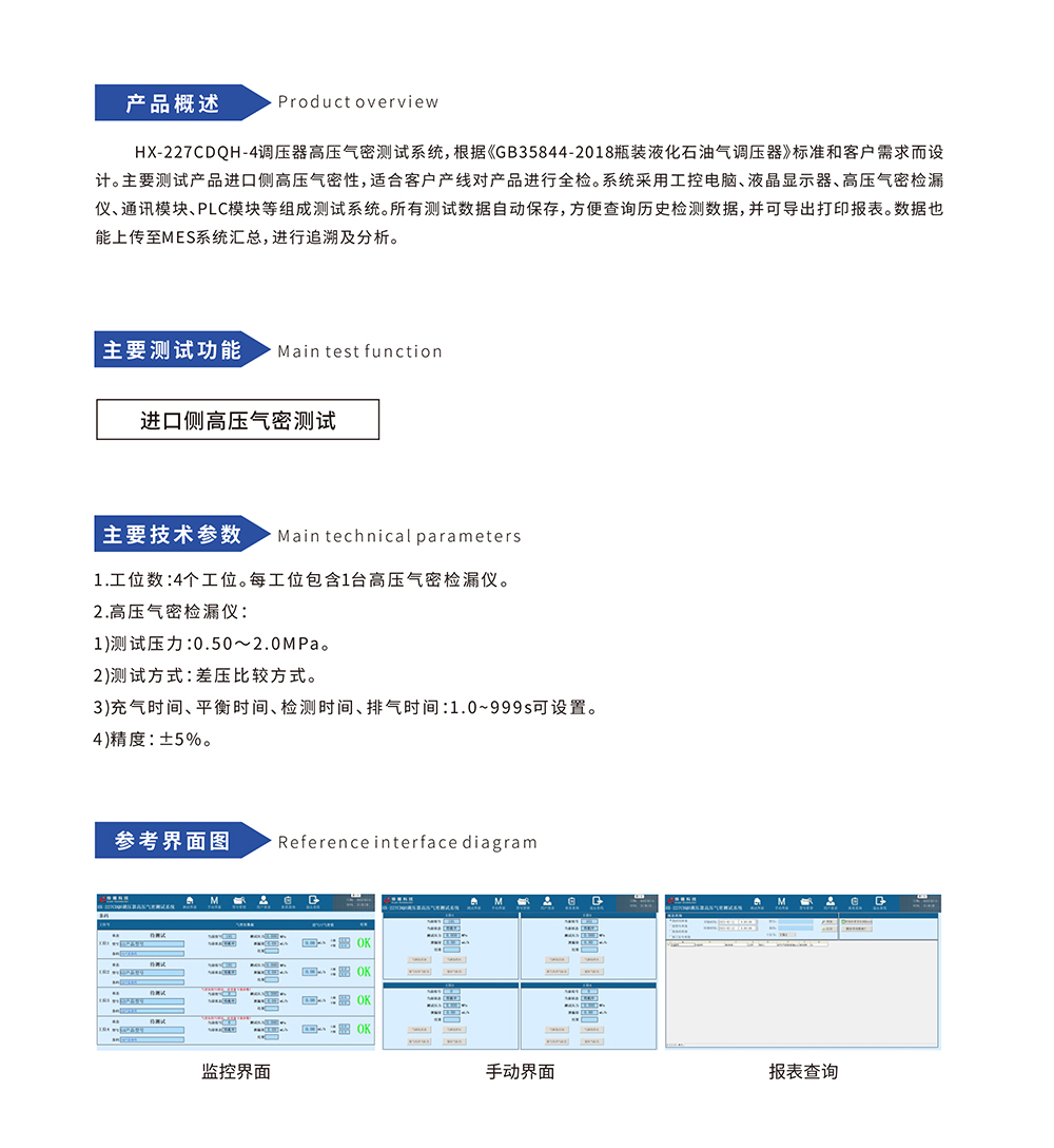 HX-227CDQH-4调压器高压气密测试系统,根据《GB35844-2018瓶装液化石油气调压器》标准和客户需求而设计。主要测试产品进口侧高压气密性,适合客户产线对产品进行全检。系统采用工控电脑、液晶显示器、高压气密检漏仪、通讯模块、PLC模块等组成测试系统。所有测试数据自动保存,方便查询历史检测数据,并可导出打印报表。数据也能上传至MES系统汇总,进行追溯及分析。