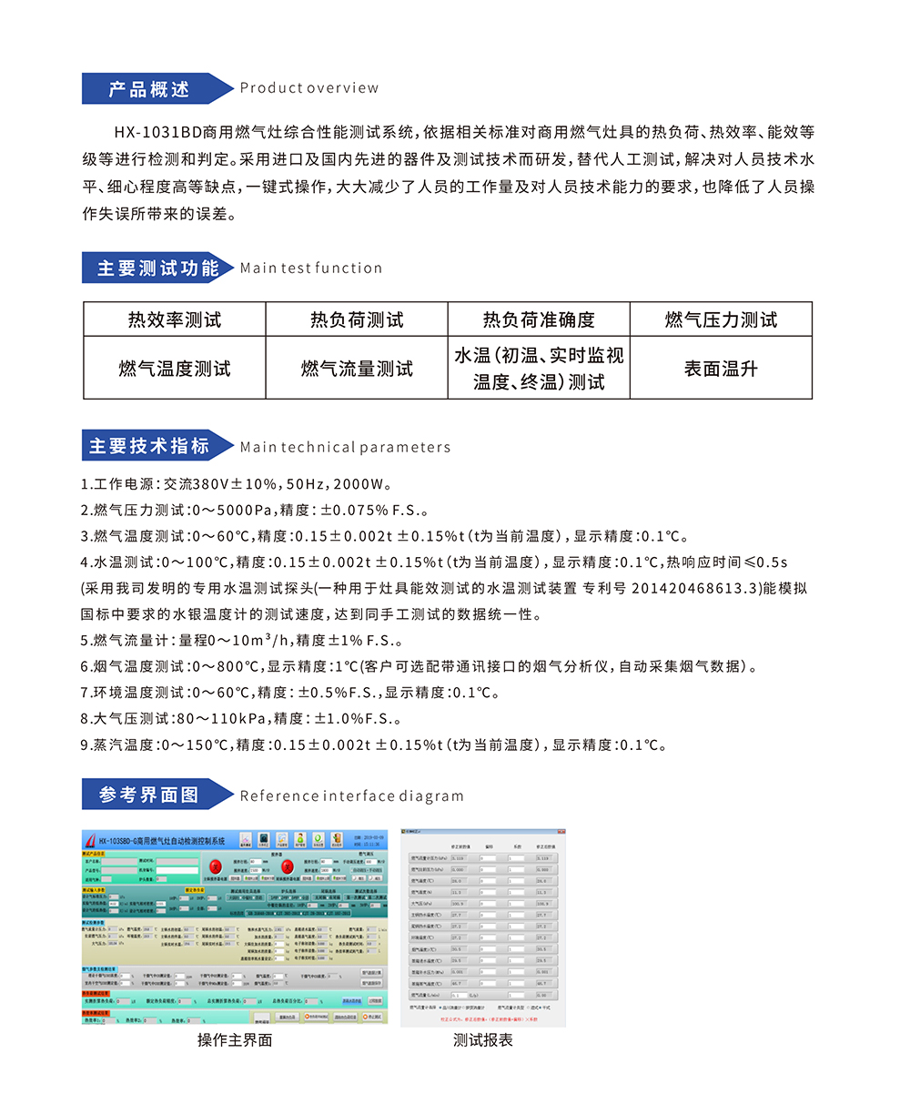 HX-1031BD商用燃气灶综合性能测试系统,依据相关标准对商用燃气灶具的热负荷、热效率、能效等级等进行检测和判定。采用进口及国内先进的器件及测试技术而研发,替代人工测试,解决对人员技术水平、细心程度高等缺点,一键式操作,大大减少了人员的工作量及对人员技术能力的要求,也降低了人员操作失误所带来的误差。