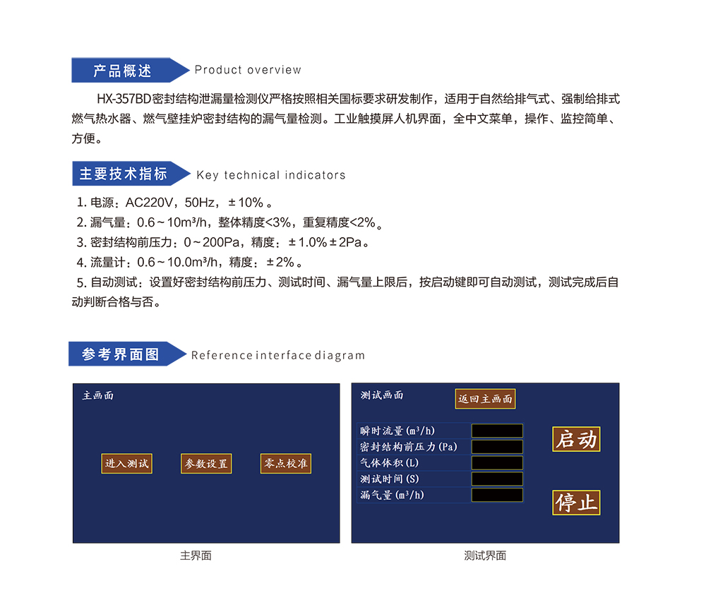 HX-357BD密封结构泄漏量检测仪严格按照相关国标要求研发制作,适用于自然给排气式、强制给排式燃气热水器、燃气壁挂炉密封结构的漏气量检测。工业触摸屏人机界面,全中文菜单,操作、监控简单.方便。