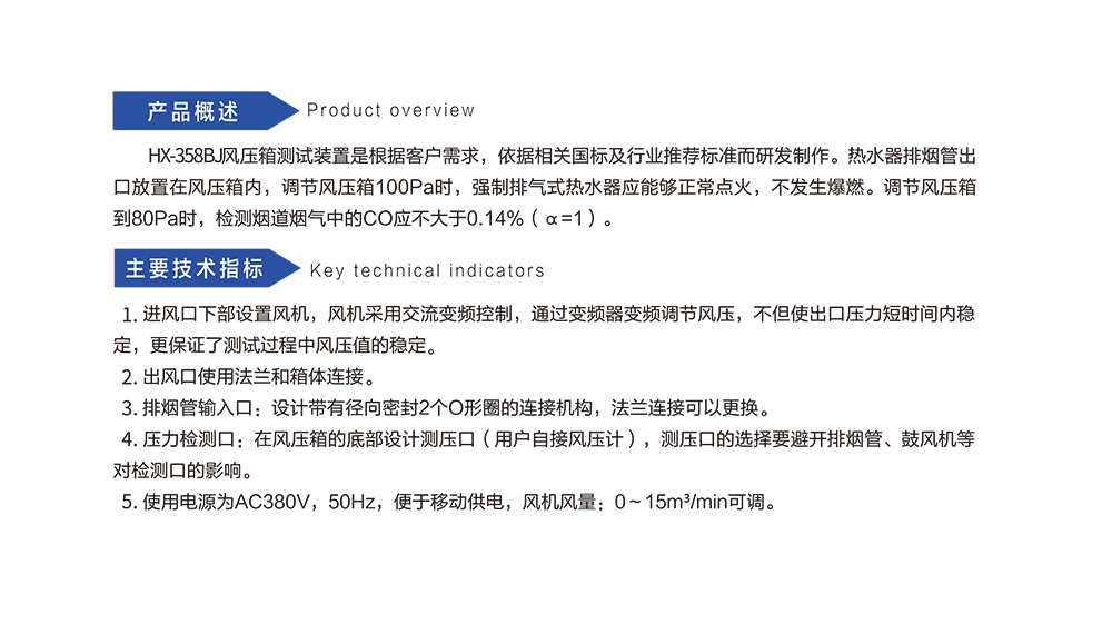 HX-358BJ风压箱测试装置是根据客户需求,依据相关国标及行业推荐标准而研发制作。热水器排烟管出口放置在风压箱内,调节风压箱100Pa时,强制排气式热水器应能够正常点火,不发生爆燃。调节风压箱到80Pa时,检测烟道烟气中的CO应不大于0.14%(α=1)。