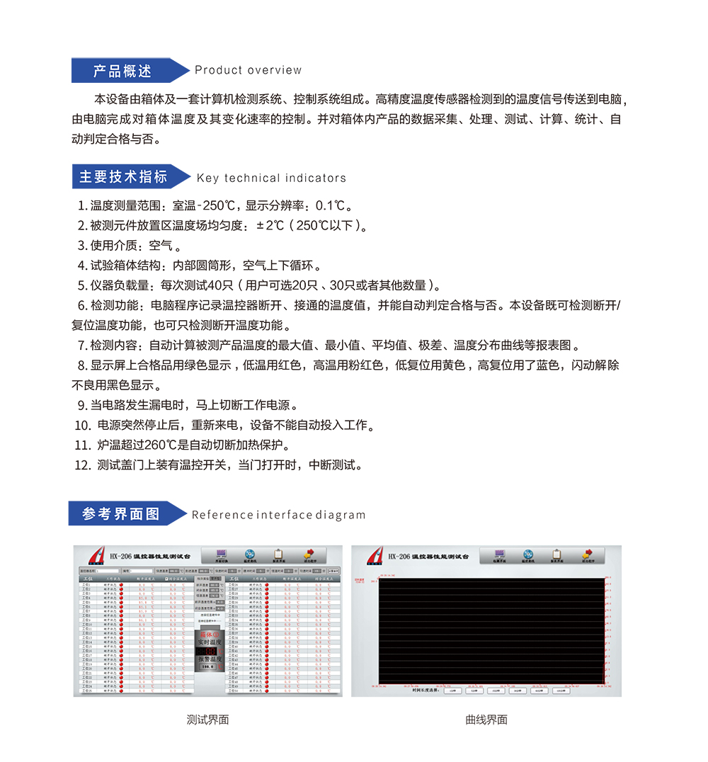 本设备由箱体及一套计算机检测系统、控制系统组成。高精度温度传感器检测到的温度信号传送到电脑由电脑完成对箱体温度及其变化速率的控制。并对箱体内产品的数据采集、处理、测试、计算、统计、自动判定合格与否。