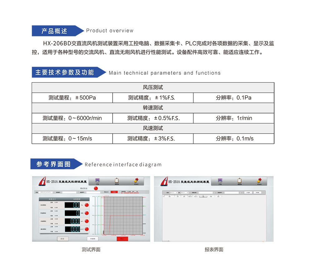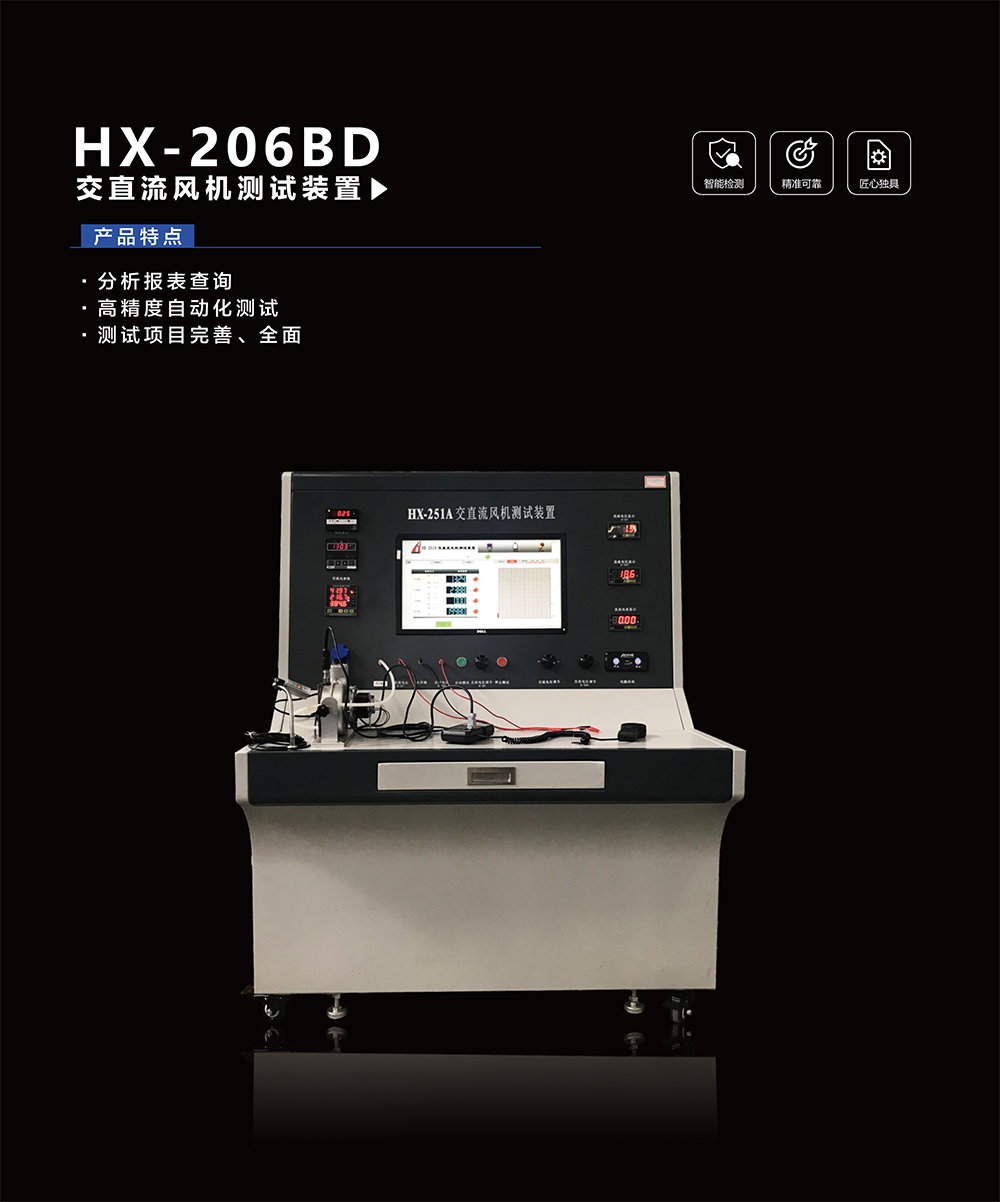 HX-206BD交直流风机测试装置采用工控电脑、数据采集卡、PLC完成对各项数据的采集、显示及监控,适用于各种型号的交流风机、直流无刷风机进行性能测试。设备配件高效可靠、能适应连续工作。