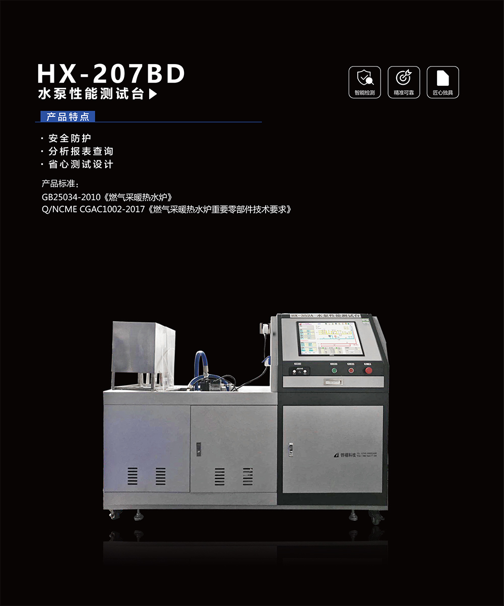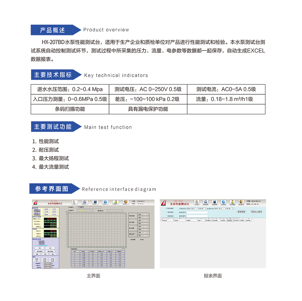 HX-207BD水泵性能测试台,适用于生产企业和质检单位对产品进行性能测试和检验。本水泵测试台测试系统自动控制测试环节,测试过程中所采集的压力、流量、电参数等数据都一起保存,自动生成EXCEL数据报表。