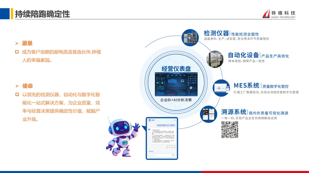 面向 AI 大数据时代,铧禧完成从设备商到一站式质造解决方案服务商的升级,构建 “自动化设备 + MES 系统 + 溯源系统 + BI+AI 决策” 的全域智能管理体系。